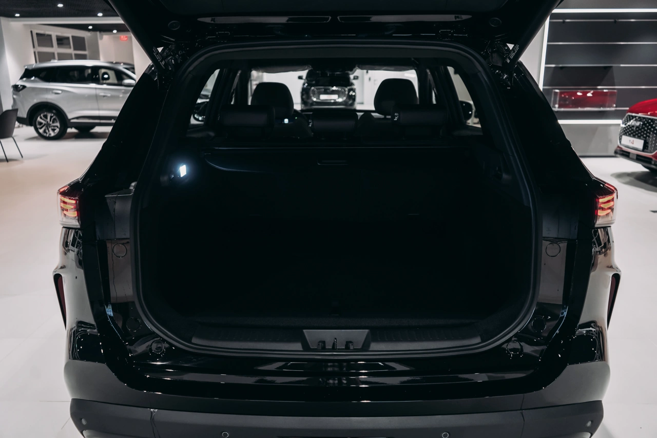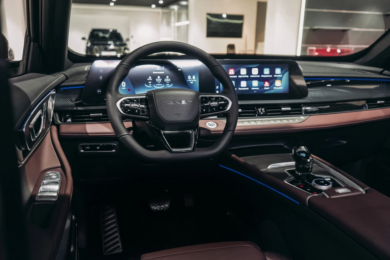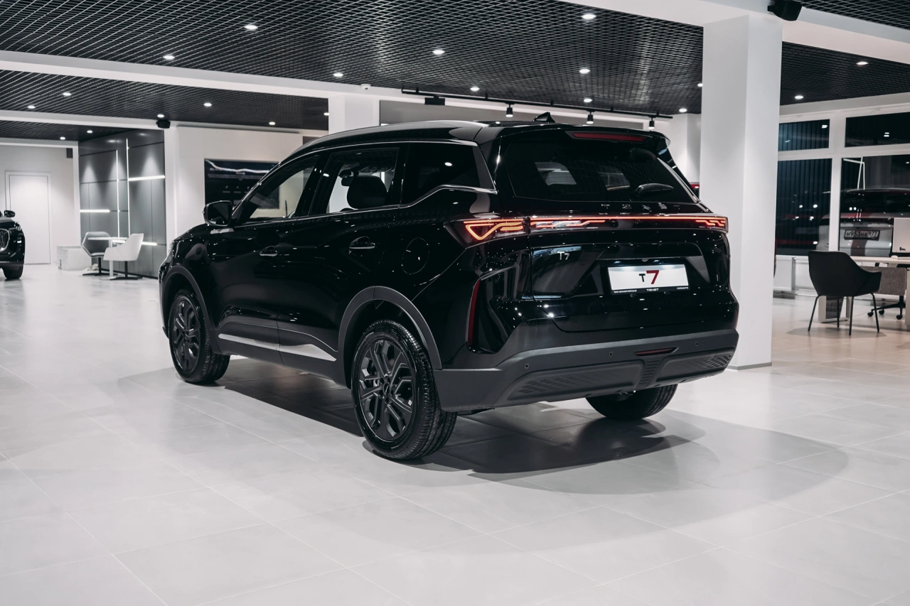TENET T7 I 2025 года — это надёжный и функциональный внедорожник, который подойдёт как для городских поездок, так и для загородных путешествий.\nАвтомобиль оснащён бензиновым двигателем объёмом 1,6 литра и мощностью 150 лошадиных сил, роботизированной коробкой передач.\nЧёрный цвет кузова и пятидверная компоновка придают автомобилю стильный и лаконичный вид.Вместительный салон с обивкой из искусственной кожи и декоративной подсветкой создаёт комфортные условия для пассажиров.\nЭлектрорегулировка сиденья пассажира и память положения сиденья водителя обеспечивают удобство при длительных поездках.\nПодогрев всех сидений, электростеклоподъёмники, регулировка руля по высоте и вылету, а также усилитель рулевого управления делают управление и пребывание в автомобиле более приятными.Автомобиль оснащён современными системами, которые упрощают управление и повышают безопасность.\nБеспроводная зарядка для смартфона, поддержка Android Auto и CarPlay позволяют оставаться на связи и использовать привычные приложения во время поездки.\nКлимат-контроль, датчик дождя, датчик света и другие функции создают комфортные условия независимо от погоды.Система доступа без ключа, запуск двигателя с кнопки и дистанционный запуск двигателя делают эксплуатацию автомобиля удобной и интуитивно понятной.\nОткрытие багажника без помощи рук и электропривод крышки багажника добавляют практичности в повседневное использование.Безопасность водителя и пассажиров обеспечивается благодаря наличию антиблокировочной системы тормозов (ABS), системы курсовой стабилизации, подушек безопасности для водителя и пассажира, боковых подушек безопасности и оконных подушек безопасности (шторок).\nКрепление для детского кресла на заднем ряду и блокировка замков задних дверей обеспечивают дополнительную защиту для детей.Рейлинги на крыше, диски размером 18 дюймов и панорамная крыша дополняют образ внедорожника, делая его универсальным выбором для различных условий эксплуатации.\nОбогрев зеркал, электрорегулировка и электроскладывание зеркал, а также обогрев лобового стекла и форсунок стеклоомывателей обеспечивают комфорт в холодное время года.