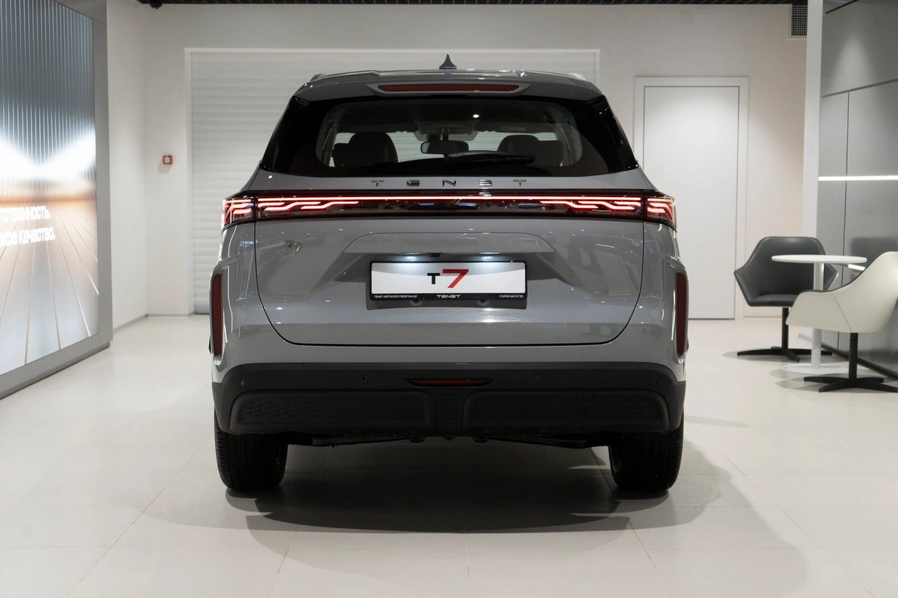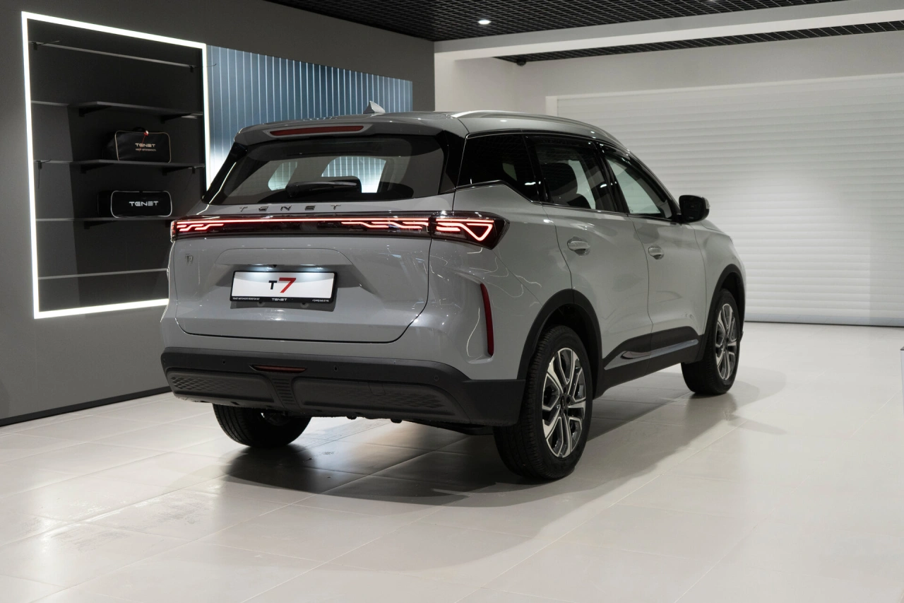 TENET T7 (I поколение) 2026 года — это внедорожник, который сочетает в себе технологичность и практичность.\nПятидверный кузов и серый цвет придают автомобилю сдержанный, но выразительный вид.\nПод капотом — бензиновый двигатель объёмом 1,6 литра и мощностью 150 лошадиных сил, который обеспечивает хорошую динамику при сохранении экономичности.\nРобот в качестве коробки передач делает управление плавным и комфортным.Автомобиль оснащён множеством функций, которые сделают повседневное использование удобным.\nВ числе них — аудиосистема с поддержкой Android Auto и CarPlay, двухзонный климат-контроль, подогрев всех сидений, электростеклоподъёмники на всех дверях.\nЭлектронная приборная панель предоставляет всю необходимую информацию, а регулировка руля по высоте и вылету позволяет настроить управление под индивидуальные предпочтения.Безопасность и комфорт вождения обеспечивают такие системы, как антиблокировочная система тормозов (ABS) и система курсовой стабилизации (ESP / ESC / DSC / VSA).\nДля удобства парковки предусмотрены парктроник и камера заднего вида.\nДатчик давления в шинах помогает следить за состоянием колёс, а датчик дождя и датчик света автоматически адаптируют работу соответствующих систем.В салоне TENET T7 комфортно всем пассажирам: обивка из кожи, обогрев рулевого колеса, передний центральный подлокотник, функция складывания спинки сиденья пассажира и третий задний подголовник создают дополнительный комфорт.\nДля семей с детьми предусмотрены крепления для детских кресел на заднем ряду и блокировка замков задних дверей.Дополнительные удобства предоставляют система доступа без ключа, дистанционный запуск двигателя и запуск двигателя с кнопки.\nОбогрев лобового стекла, форсунок стеклоомывателей и зеркал, а также электрорегулировка зеркал делают поездки в холодное время года более комфортными.\nРейлинги на крыше и 18-дюймовые диски дополняют внешний вид автомобиля и расширяют его функциональность.TENET T7 — это надёжный автомобиль, который подойдёт как для городских поездок, так и для путешествий за город.