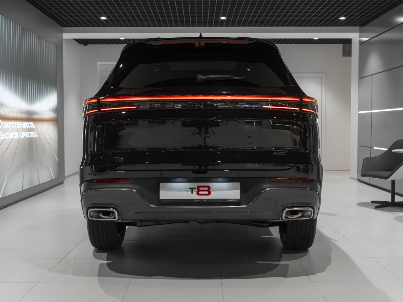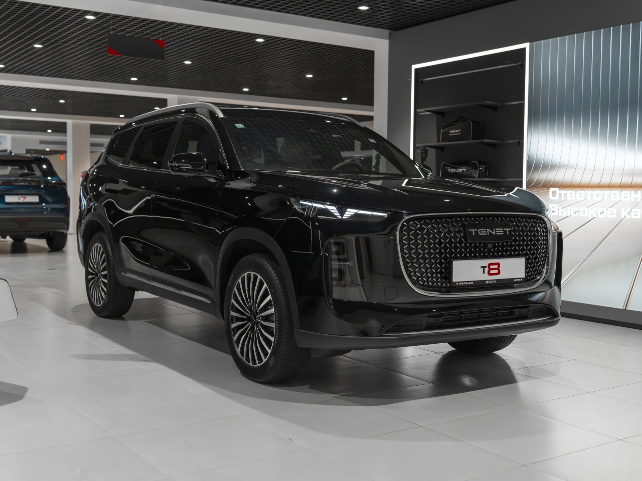 TENET T8 I 2025 года — это пятидверный внедорожник, который сочетает в себе технологичность и практичность.\nАвтомобиль оснащён двухлитровым бензиновым двигателем мощностью 197 лошадиных сил и роботизированной коробкой передач.Чёрный кузов и продуманный дизайн придают автомобилю современный вид, а просторный салон с обивкой из искусственной кожи и декоративной подсветкой создаёт комфортные условия для всех пассажиров.\nЭлектрорегулировка и память положения сиденья водителя, а также электрорегулировка сиденья пассажира обеспечивают удобство и персонализацию.\nПодогрев всех сидений и вентиляция передних сидений добавляют комфорта в холодное время года.Автомобиль оснащён современными системами, которые делают вождение более удобным и безопасным.\nАдаптивный круиз-контроль, система старт-стоп, датчик давления в шинах, система курсовой стабилизации и другие функции помогают водителю контролировать ситуацию на дороге.\nПроекционный дисплей и мультифункциональное рулевое колесо упрощают доступ к основным функциям автомобиля.Безопасность TENET T8 I обеспечивают многочисленные системы и функции: антиблокировочная система тормозов (ABS), антипробуксовочная система, система курсовой стабилизации, система помощи при торможении, подушки безопасности для водителя и пассажира, боковые подушки безопасности, оконные подушки безопасности (шторки), датчик усталости водителя, система контроля слепых зон и система контроля за полосой движения.Для удобства использования предусмотрены такие функции, как запуск двигателя с кнопки, система доступа без ключа, открытие багажника без помощи рук и электропривод крышки багажника.\nПарктроник передний и задний, камера 360, а также система управления дальним светом делают вождение более комфортным и безопасным.Рейлинги на крыше, диски 19 дюймов и панорамная крыша дополняют образ внедорожника, делая его универсальным выбором для городских поездок и загородных путешествий.