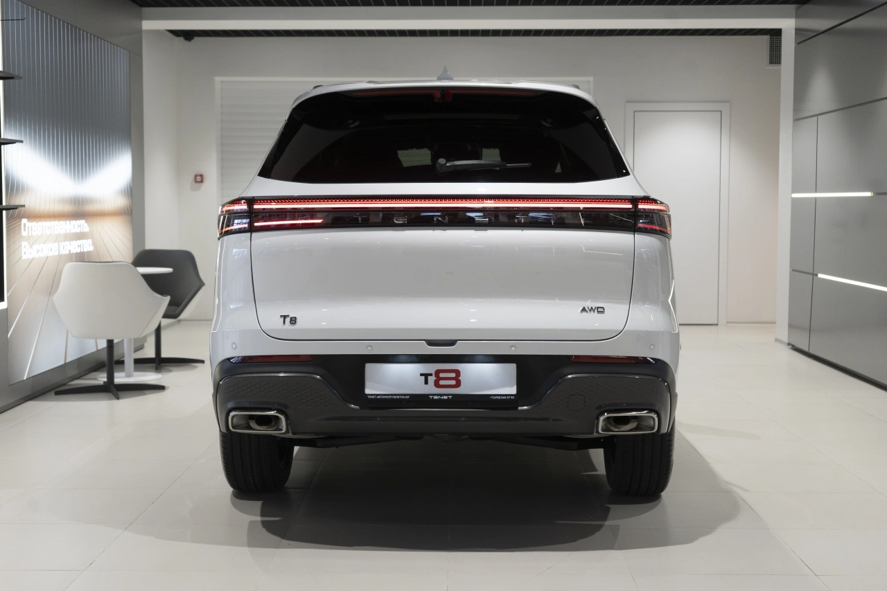 TENET T8 I 2025 года — это пятидверный внедорожник, который сочетает в себе функциональность и технологичность.\nДвухлитровый бензиновый двигатель мощностью 197 лошадиных сил и роботизированная коробка передач обеспечивают уверенное движение как по городу, так и за его пределами.Белый кузов придаёт автомобилю стильный вид, а просторный салон с обивкой из искусственной кожи и декоративной подсветкой создаёт комфортные условия для всех пассажиров.\nЭлектрорегулировка и подогрев сидений, а также двухзонный климат-контроль позволяют настроить оптимальное положение и температуру для каждого пассажира.Автомобиль оснащён бортовым компьютером, аудиосистемой, Bluetooth, USB и беспроводной зарядкой для смартфона.\nМультифункциональное рулевое колесо с обогревом и регулировка руля по высоте и вылету обеспечивают удобство управления.\nЗапуск двигателя с кнопки, система доступа без ключа и дистанционный запуск двигателя добавляют практичности в повседневное использование.Безопасность на дороге обеспечивают антиблокировочная система тормозов (ABS), антипробуксовочная система (ASR / TCS / TRC), система курсовой стабилизации (ESP / ESC / DSC / VSA) и система помощи при торможении.\nПодушки безопасности для водителя и пассажира, коленная подушка безопасности водителя, боковые подушки безопасности, задние боковые подушки безопасности и оконные подушки безопасности (шторки) создают надёжную защиту для всех пассажиров.Дополнительные функции, такие как система контроля слепых зон, система контроля за полосой движения, датчик усталости водителя, парктроники передний и задний, камера 360, делают вождение более комфортным и безопасным.\nОбогрев лобового стекла, форсунок стеклоомывателей и зеркал, а также электрорегулировка и складывание зеркал добавляют удобства в эксплуатации.Рейлинги на крыше, диски 19 дюймов, центральный замок и иммобилайзер дополняют образ этого технологичного внедорожника.\nПанорамная крыша и люк создают ощущение простора и свободы.\nТретий ряд сидений и функция складывания спинки сиденья пассажира обеспечивают гибкость в использовании пространства салона.